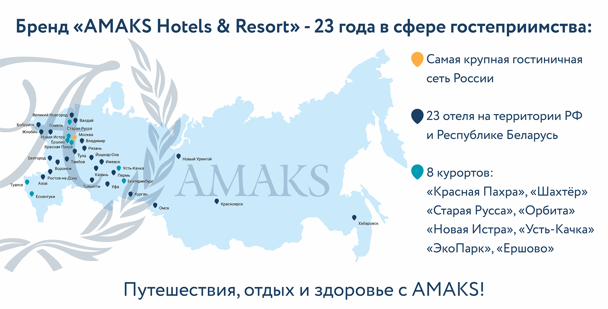 Сеть отелей и курортов AMAKS «Hotels&Resorts» - одна из крупнейших компаний в сфере гостеприимства. Мы гордимся нашими отелями и курортами, которые расположены в 7 часовых поясах от Азова до Хабаровска. Наша команда – более 6 000 человек в 23 гостиницах и 7 курортах. Каждый день мы создаем "дом вдали от дома" для гостей в 20 регионах России и Республике Беларусь! Мы ищем активных, готовых к профессиональному росту и развитию людей!