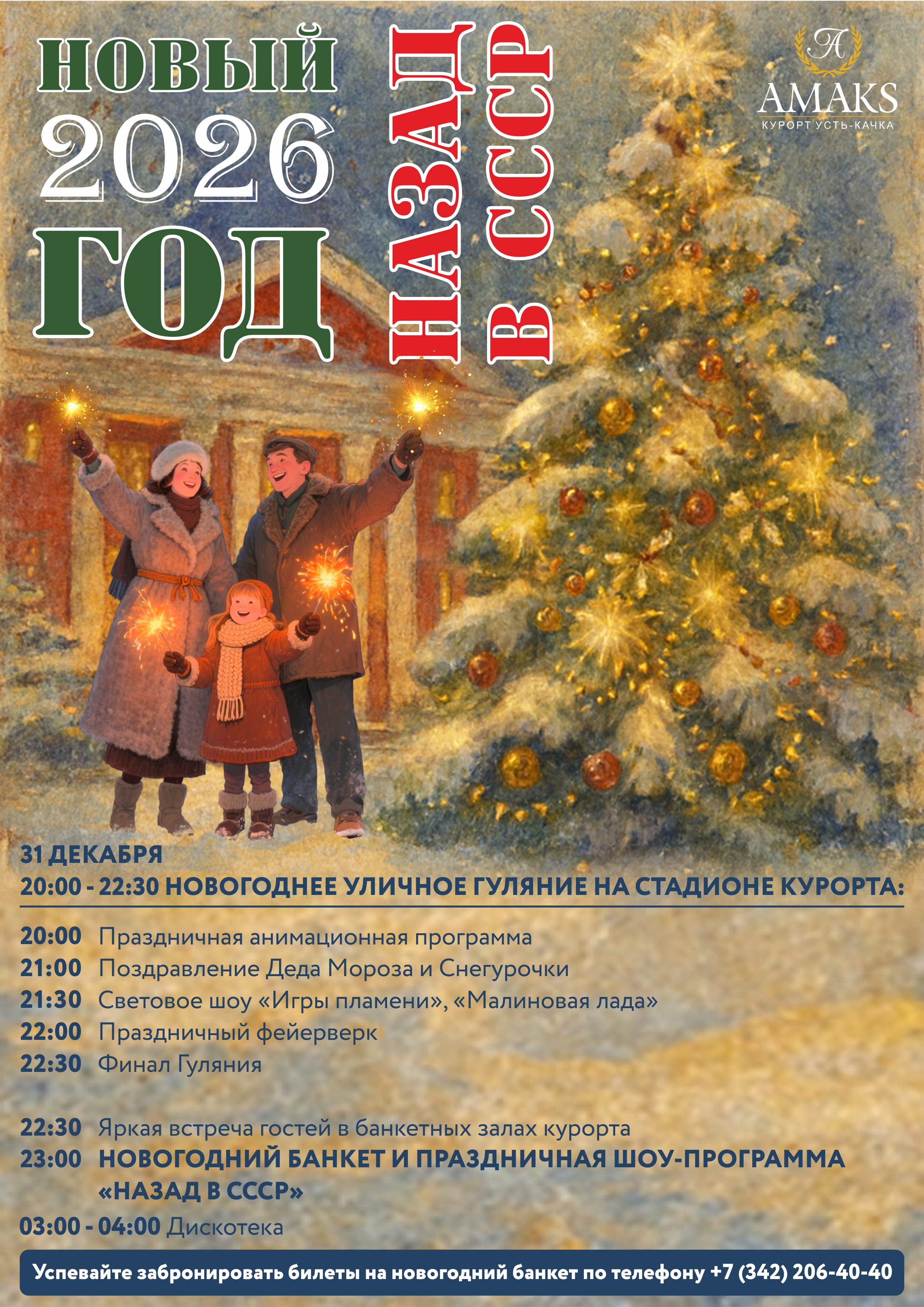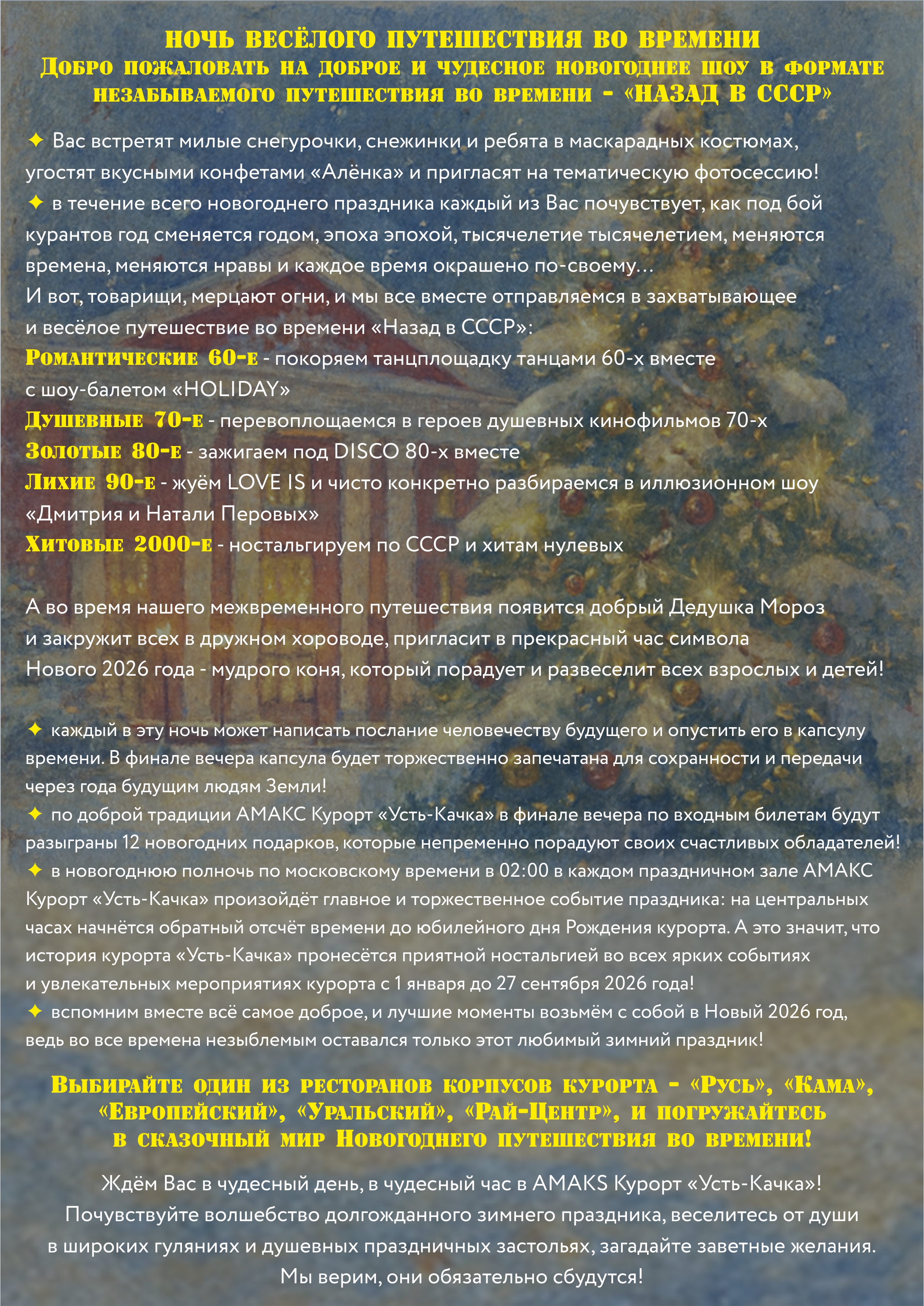 Сколько лет пролетело, как мгновение… А когда-то всё ещё только зарождалось - в далёком 1936 году, ещё в Советском Союзе начиналась история любимого курорта! Это время вспоминают с особенной теплотой и ностальгией, и поэтому Новый 2026 год АМАКС Курорт «Усть-Качка» приглашает Вас встретить тепло, душевно с яркими и добрыми воспоминаниями из Советского Союза в атмосфере любимого зимнего праздника всех времён.